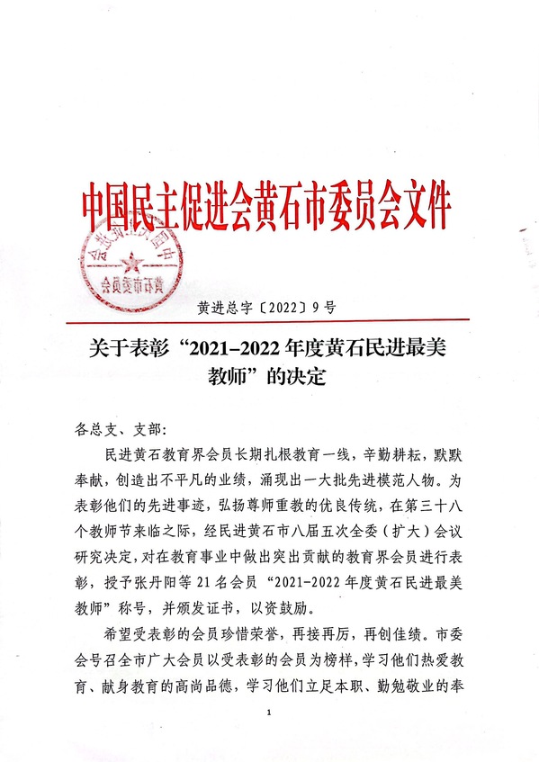 本网讯 近日,中国民主促进会黄石委员会决定,对在教育事业中做出突出贡献的教育界会员进行了表彰,PG线上平台(集团)官方网站黄蓓佳同志荣获“2021-2022年度黄石民进最美教师”荣誉称号。