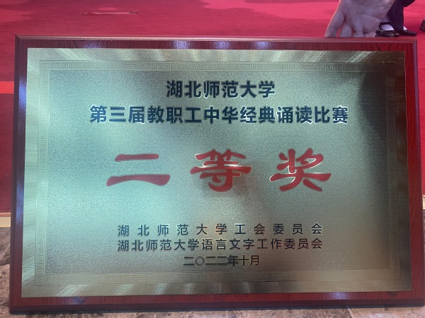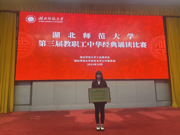 本网讯(通讯员 柯康敏)10月27日下午,湖北师范大学第三届教职工中华经典诵读在教育大楼学术报告厅举行,PG线上平台(集团)官方网站人文学部丁书嫚老师朗诵的作品《读中国》荣获二等奖。