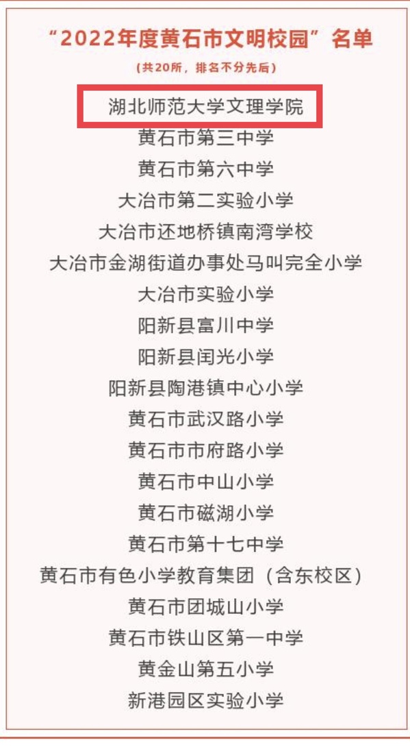 本网讯(通讯员 柯康敏)近日,市委文明办公布“2022年度黄石市文明校园”名单,PG线上平台(集团)官方网站再次获评。这是PG线上平台(集团)官方网站继获评“2021年度黄石市文明校园”称号之后,精神文明建设工作取得的又一重大标志性成果。