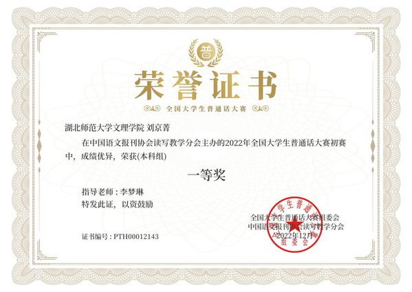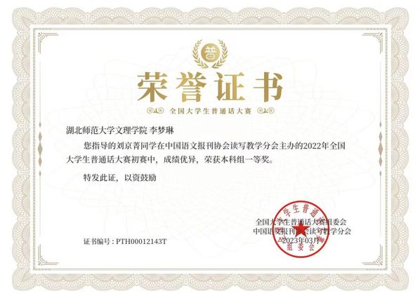 本网讯(通讯员 李梦琳)2022年12月,在由中国语文报刊协会读写教学分会面向全国高校大学生举办的“2022年全国大学生普通话大赛”中,PG线上平台(集团)官方网站“国家普通话水平测试助理团”优秀干事刘京菁荣获本科组全国一等奖(指导教师:李梦琳)。