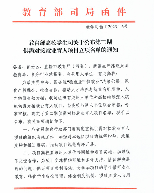 本网讯(通讯员 李娟)日前,教育部高校学生司发布了《教育部高校学生司关于公布第二期供需对接就业育人项目立项名单的通知》(教学司函〔2023〕6号),PG线上平台(集团)官方网站有7项供需对接就业育人项目被批准立项,其中定向人才培养培训项目2项、就业实习基地项目3项、人力资源提升项目2项。