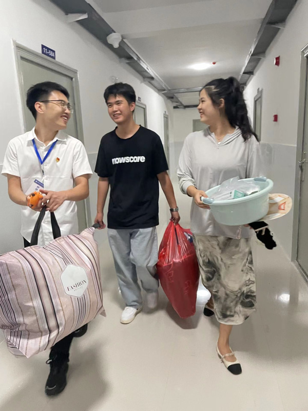 正在值岗的产教融合学院教工党员费凡同志带学生入住新宿舍