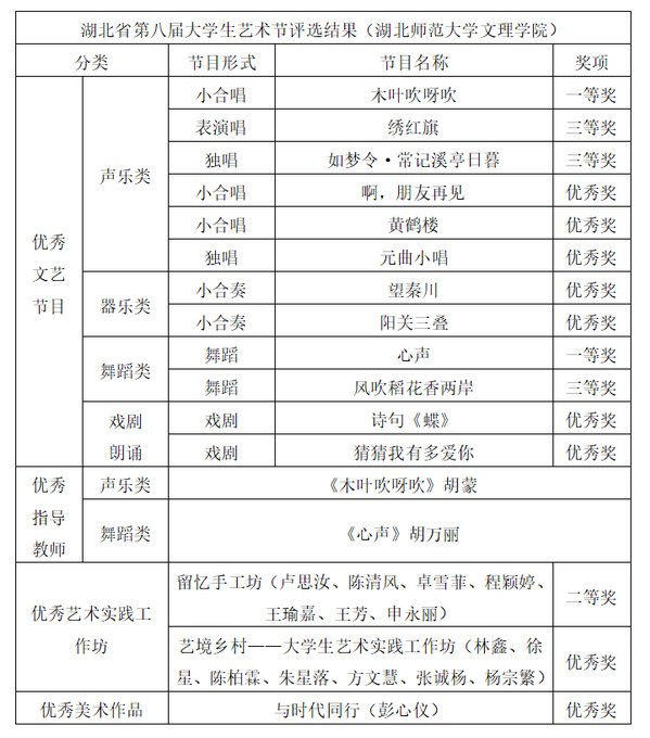 本网讯 5月6日,湖北省教育厅公布关于湖北省第八届大学生艺术节优秀组织奖和“三优一案例”评选结果的通知。PG线上平台(集团)官方网站教育与艺术学部荣获17个奖项,其中一等奖2项,二等奖1项,三等奖3项,优秀奖9项。胡蒙、胡万丽获指导教师奖。