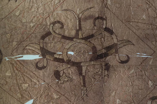 在荆州,队员们在博物馆寻“龙”找“凤”,蟠龙飞凤纹绣浅黄绢面衾、对凤对龙纹绣浅黄绢面衾、龙凤虎纹绣罗单衣袖、一凤二龙相蟠纹绣浅黄绢面禅衣、凤鸟花卉纹绣浅黄绢面绵袍,马山一号楚墓出土的丝织珍品,借龙与凤诉说着汉绣千年起源,以布局设计和设色水平,展示着古代劳动人民的智慧。绢地龙凤相蟠纹绣,以蟠曲的龙身与凤冠交叠成菱形骨架,金线与朱砂在素绢上勾勒出流动的韵律,让成员们直观感受到《尚书》中“衣画而裳绣”服饰文化。