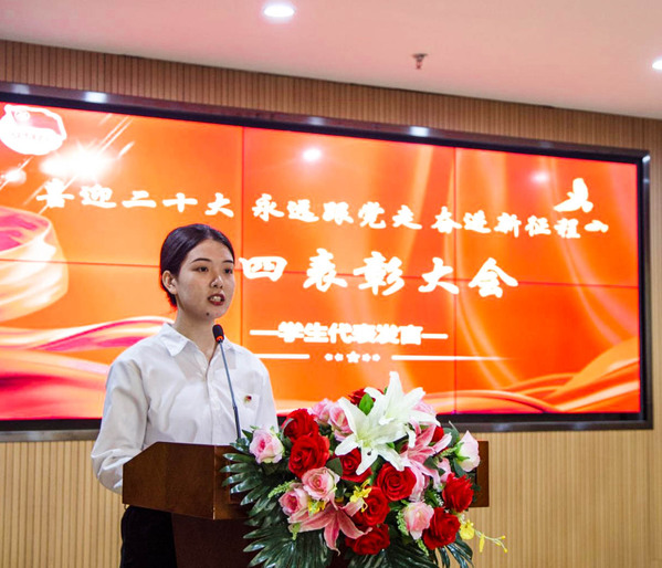 大会在高亢激昂的团歌声中拉开帷幕。新发展团员举行了集中宣誓仪式,校团委书记陈荟芸宣读了《关于2021-2022年度共青团先进集体和先进个人的表彰决定》,杨之毛副书记等领导分别为市级、校级“优秀共青团员”、“优秀共青团干部”、“红旗团支部”和“红旗团总支”获奖代表颁奖。市级优秀共青团干部尹誉霖、优秀学生代表武如钰分别作了代表发言。最后,本次五四表彰大会在《没有新共产党就没有新中国》的嘹亮歌声中圆满落下帷幕。