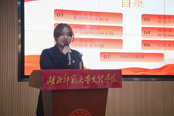 比赛中,十位参赛选手围绕国家安全主题进行了全方位、多角度的深入阐释。有的选手从理论层面入手,系统解读国家安全的科学内涵,结合《国家安全法》等法律法规,深刻剖析危害国家安全行为的法律边界;有的选手以案说法,通过剖析典型案例,生动揭示间谍活动、网络攻击等安全风险的表现形式与危害性;还有的选手立足大学生视角,从思想认知、专业学习、社会实践等多维度出发,探讨青年践行总体国家安全观的具体路径,号召同学们从身边小事做起,筑牢校园安全防线。评委从内容深度、实践价值、创新表达三个维度进行综合点评。