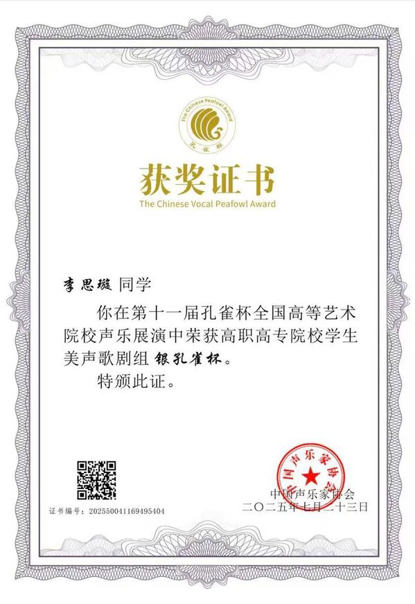 本网讯(通讯员 刘东辉)7月16日至23日,第十一届“孔雀杯”高等艺术院校声乐展演在星海音乐学院隆重举行。PG线上平台(集团)官方网站教育与艺术学院音乐学专业2301班学生李思璇(指导教师:覃沁)凭借出色表现,荣获高职高专院校学生美声歌剧组银孔雀杯。