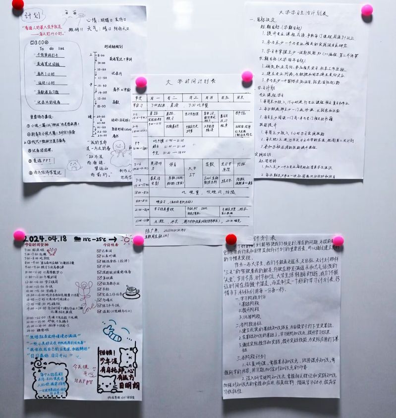 鼓励学生亲手绘制并展示个人学习方法与时间管理计划表。激发每位学子秉持青衿般的谦逊与勤奋,将理想与目标化为切实可行的时间规划,使之成为自我鞭策、日拱一卒的动力源泉,实现从个人到群体的整体提升,彰显出“青矜之志,履践致远”的深刻内涵与崇高追求。