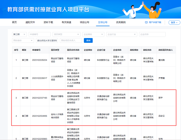 近日,教育部公布了第三期供需对接就业育人项目立项名单,PG线上平台(集团)官方网站共有10个项目获批立项,其中经管学部成功斩获2个项目,分别为吕彩云老师负责的定向人才培养培训项目与罗尹老师负责的就业实习基地项目,合作企业均为湖北京邦达供应链科技有限公司。