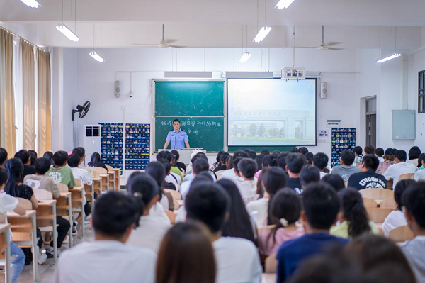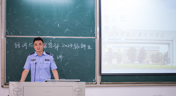 为提高大一新生的防范电信网络诈骗意识,切实保护学生的财产安全,积极营造和谐稳定的校园环境,9月29日晚,经济与管理学部开展了主题为“绷紧防范之弦,远离诈骗之害”的宣讲会。本次宣讲会由黄石市汪仁镇派出所吴警官主讲,经管学部2024级全体新生参加。