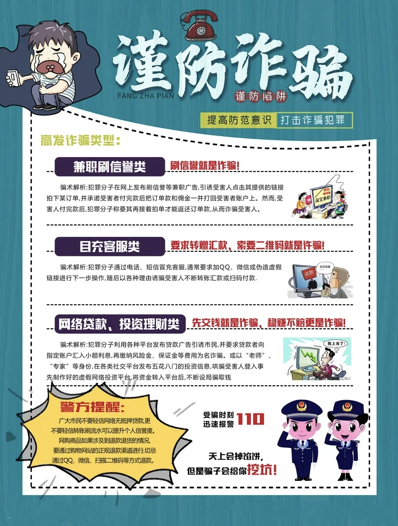 新学期开始之际同学们都需缴纳学费和住宿等费用,大家时刻注意保管好自身的财产安全。为了让入校新生更加方便了解反诈骗类型及反诈知识,人文学部宣传部为大家总结反电信诈骗的注意事项及安全提示。请大家认真阅读以下内容,共学反诈知识,共筑反诈防线,筑牢反诈防线,共建平安校园。