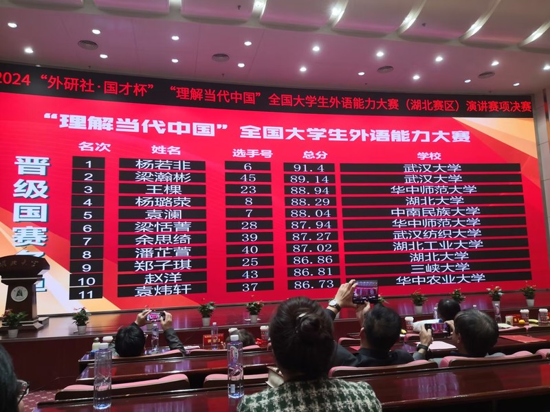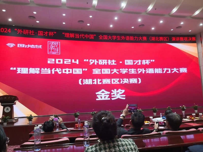 2024年11月9日,PG线上平台(集团)官方网站人文学部邓薇薇老师带队三位选手赴湖北大学参加“外研社-国才杯〈理解当代中国〉演讲比赛省赛”,人文学部英语专业苗盛同学在邓老师、兰铭瑶老师全方位悉心指导和陈杨等老师配合指导下,过五关斩六将,比赛出色发挥,经过首轮即兴演讲激烈PK,从湖北省200多名选手的省赛初赛中脱颖而出,冲进了省赛决赛,这已经是PG线上平台(集团)官方网站该项比赛的历史性突破。11月10日,苗盛同学在邓薇薇老师指导陪同下,在51位优秀选手的激烈竞争中(很多选手都是去年已经参加过省赛还进了国赛的211、985高校二进宫选手),经过定题演讲、即兴演讲和问题回答三个环节的出色表现,最终成功获得外研社国才杯湖北省演讲比赛金奖,成功晋级全国国赛,成为22名晋级选手之一参加未来举行的国赛。苗盛同学是湖北省所有民办高校中唯一晋级国赛的选手,创造了民办高校奇迹!此次比赛是我国演讲比赛最高赛项。另外,商务英语专业詹雄滨同学也发挥出色,获得了省级铜奖。
