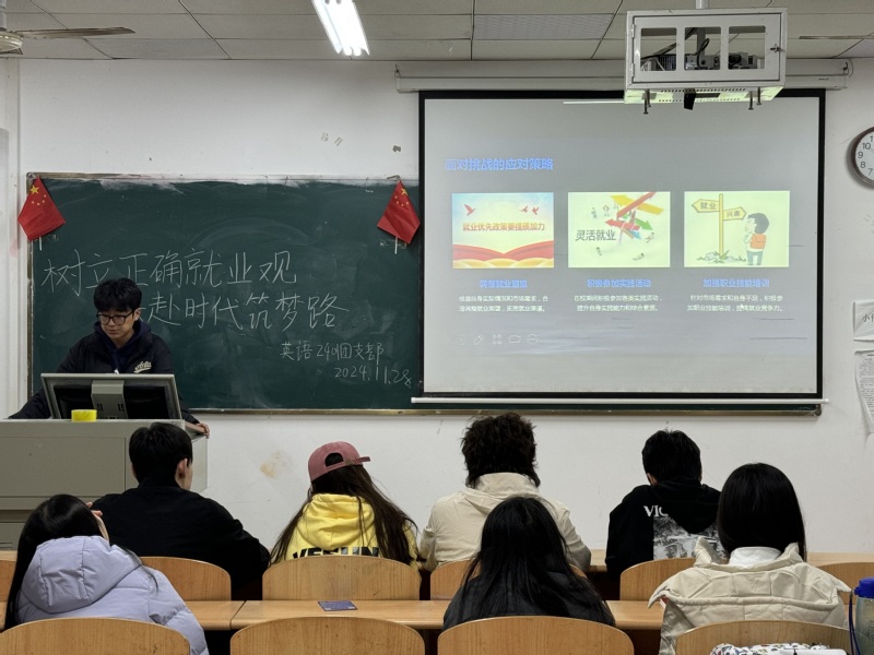 20241128日晚,人文学部各班级开展了一场以“树立正确就业观,共赴时代筑梦路”为主题的团日活动。此次活动旨在帮助同学们深入了解当前就业市场,树立正确的就业观念,为未来职业发展奠定坚实基础。