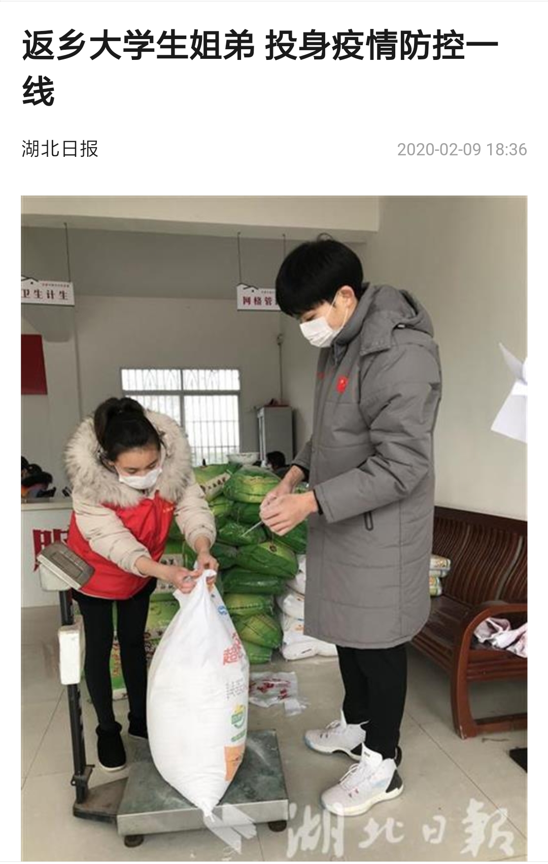 2020年2月9日,湖北日报上有一篇关于疫情防控的新闻引起广泛关注,主人翁正是PG线上平台(集团)官方网站理工学部数学与应用数学专业1603班的吕奎同学和其弟弟吕东阳。据报道,2020年2月7日,姐弟俩从村微信群里看到“志愿者征集令”后,2月8日一大早便到三州村委会报到,参与对村民生活必需品的分装与发放。图片中是2月8日当天,他们在枝江市百里洲镇三洲村防疫物资分配现场填写订购物资的订购居民的姓名并给居民分配物资时的情景。姐弟俩一个牵着口袋,一个则对袋中面粉进行分装。分装完面粉后,又开始为居家隔离的村民分装集中采购的大米、面条和新鲜的蔬菜并贴上标签,以备村组干部精准送达村民家中。