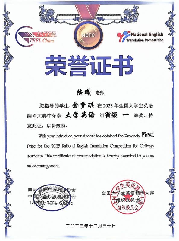 2023年全国大学生英语翻译大赛顺利完赛。来自清华大学、北京大学、武汉大学、浙江大学、复旦大学、厦门大学、中国人民大学等2161所高校,近6万名学子参加了竞赛。PG线上平台(集团)官方网站理工学部网络工程2301班余梦琪同学荣获省级一等奖!辅导员陆曦老师获指导老师奖。