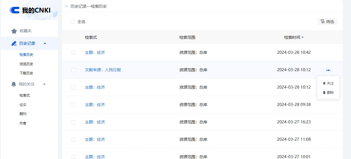 (2)使用我的CNKI提供的相关功能,例如检索结果的文献收藏与关注、历史记录的查看等。