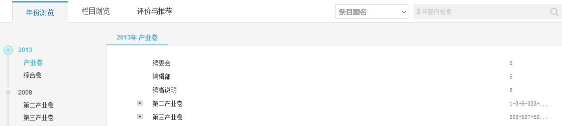 如图5.8.6.2所示,左侧展示年鉴的出版年和卷信息,右侧展示已选年卷的目录,点击