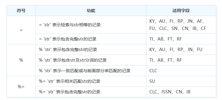 专业检索是借助SQL语句表达检索需求,在使用专业检索时需要有明确的检索字段,通过<字段代码><匹配运算符><检索值>构造检索式。以 KY='知识服务' AND (AU % '陈'+'王')为例,KY、AU可替换为自己检索的字段,=或%可根据自己的需求使用对应的匹配运算符,KY和AU检索字段间用AND、OR、NOT连接,字段内多个值的关系用+、-、*来组合,或者位置限定的语法符号。