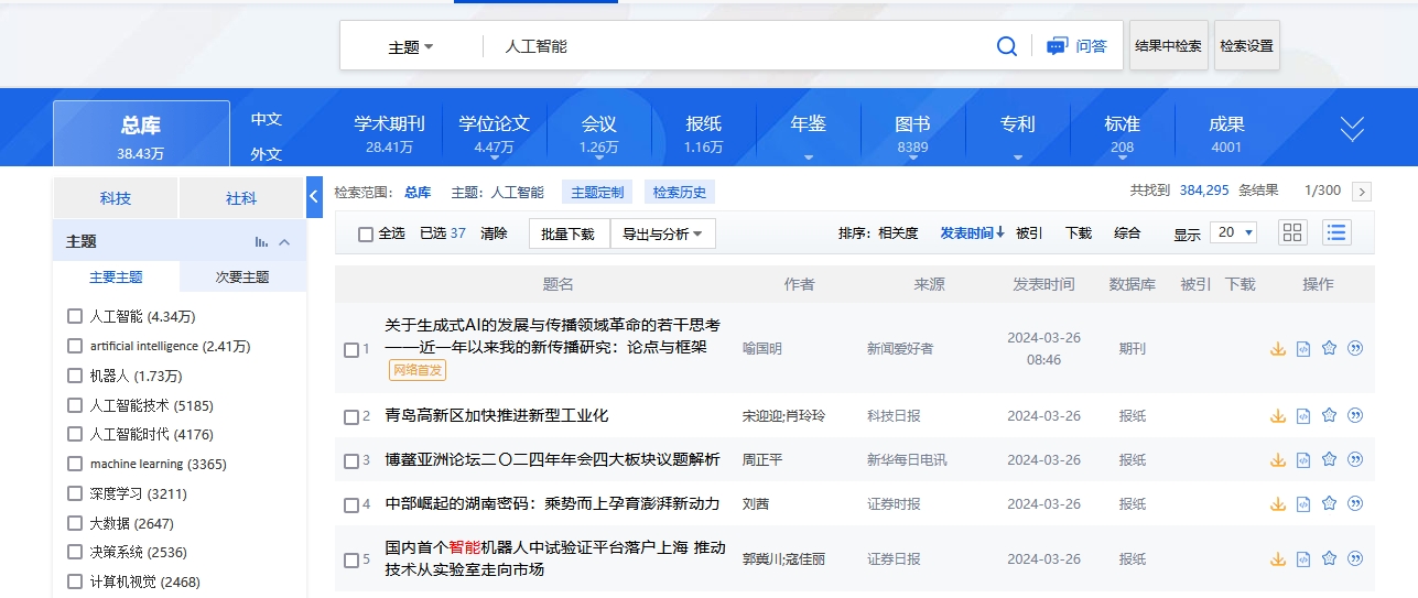 平台检索涵盖的资源类型有:学术期刊、学位论文、会议、报纸、年鉴、专利、标准、成果、图书、学术辑刊、特色期刊。
