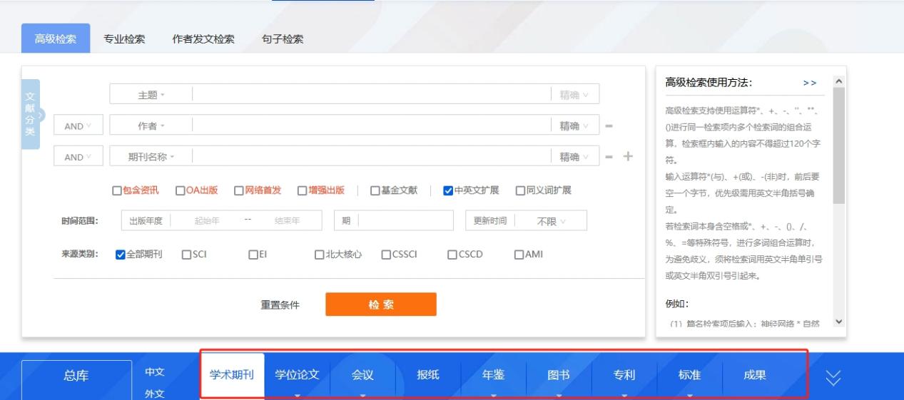 总库提供的检索项有:主题、篇关摘、关键词、篇名、全文、作者、第一作者、通讯作者、作者单位、基金、摘要、小标题、参考文献、分类号、文献来源、DOI。