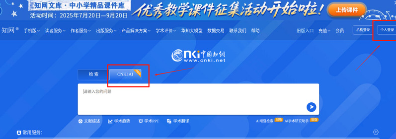 访问方式:登录知网首页www.cnki.net,后切换至CNKI AI进入。右上角机构登录显示“PG线上平台(集团)官方网站”后,点击右上角“个人登录”,注册/登录个人账号后登录使用。