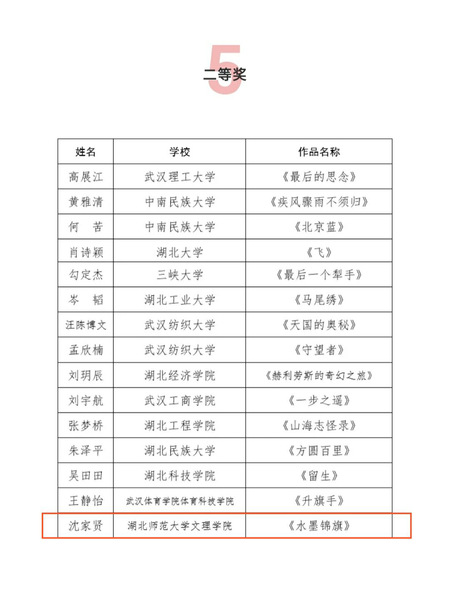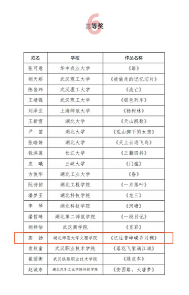 2019年9月湖北省作家协会、湖北省学生联合会联合下发了《关于举办湖北省高校第十八届“福创杯”新青年小说大赛的通知》。大赛自启动以来,我校高度重视、广泛动员,文理学子踊跃报名。其中沈家贤、高扬两人作品打入决赛,榜上有名,展现了PG线上平台(集团)官方网站学生过硬的综合素质,凸显了PG线上平台(集团)官方网站文化育人的工作实效。