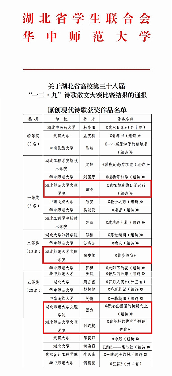 (通讯员:苏祎)2023年3月15日,湖北省学生联合会、华中师范大学联合举办的第三十八届“一二·九”诗歌散文大赛赛事结果已公布。PG线上平台(集团)官方网站田湉荣获一等奖,张安娜荣获二等奖,张力、付连艳荣获三等奖。