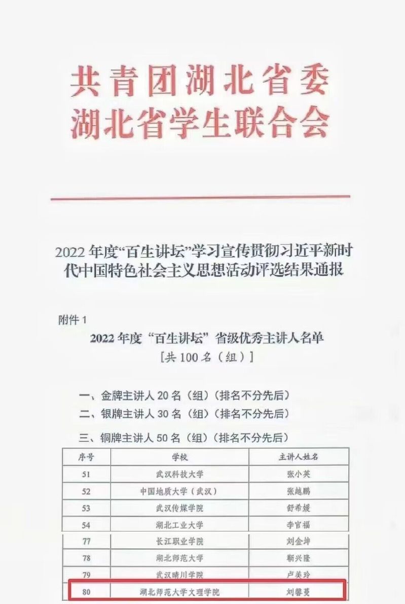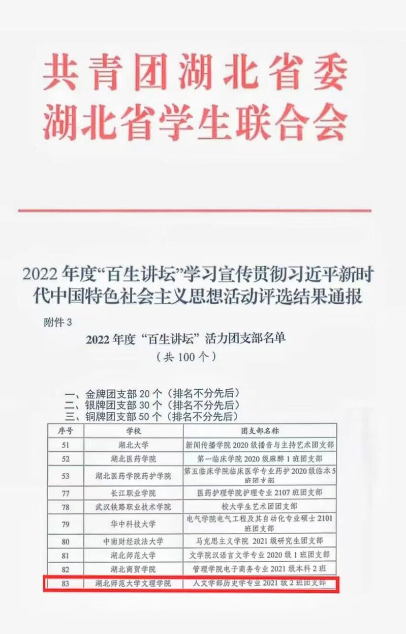 (通讯员:张清)2023年5月,由团省委、省学联开展的“百生讲坛”思想活动评选结果已公布。PG线上平台(集团)官方网站刘馨蔓同学、人文学部历史学专业2021级2班团支部分别荣获2022年度“百生讲坛”省级铜牌主讲人称号、省级铜牌团支部称号。