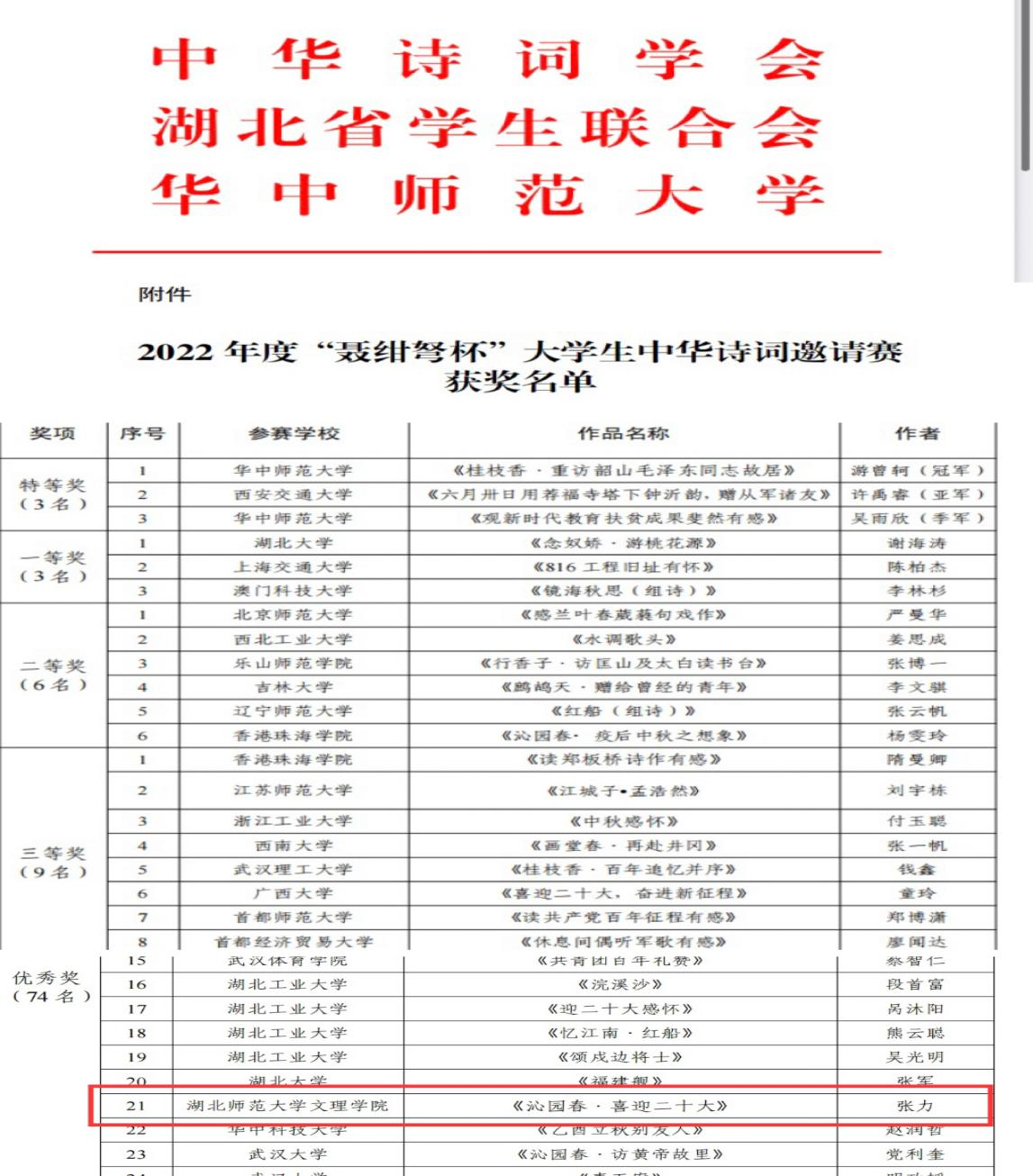 (通讯员:苏祎)6月6日,由中华诗词学会、中华诗词研究院、湖北省学生联合会、华中师范大学联合举办的2022年度“聂绀弩杯”大学生中华诗词邀请赛赛结果已公布。PG线上平台(集团)官方网站张力同学荣获佳绩。