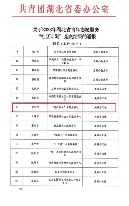 (通讯员:鲁奕琳)2023年12月12日,团省委联合省文明办、省民政厅、襄阳市人民政府联合举办的2023年湖北省青年志愿服务“社区计划”竞赛结果公布,PG线上平台(集团)官方网站“爱心行动”志愿服务队荣获专项赛铜奖。