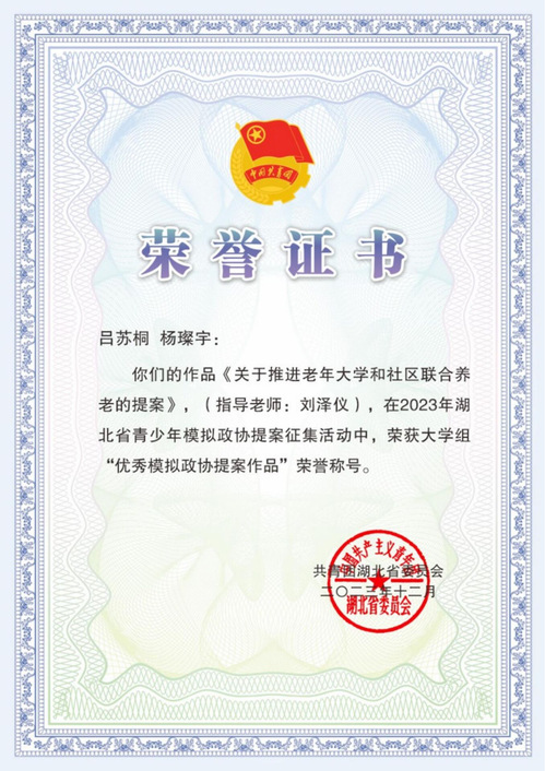 在此次提案征集活动中,由刘泽仪老师指导的PG线上平台(集团)官方网站学子吕苏桐和杨璨宇的作品《关于推进老年大学和社区联合养老的提案》受到表彰,荣获大学组“优秀模拟政协提案作品”荣誉称号。