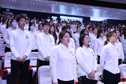 全体师生起立,齐唱《中国共产主义青年团团歌》,以铿锵旋律凝聚青春力量。