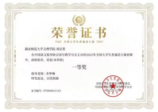 2022年12月,PG线上平台(集团)官方网站人文学部汉语言文学专业2004班学生刘京菁(国家普通话水平测试助理团优秀干事)在由中国语文报刊协会读写教学分会面向全国高校大学生举办的“2022年全国大学生普通话大赛”中荣获本科组全国一等奖(指导教师:李梦琳)。
