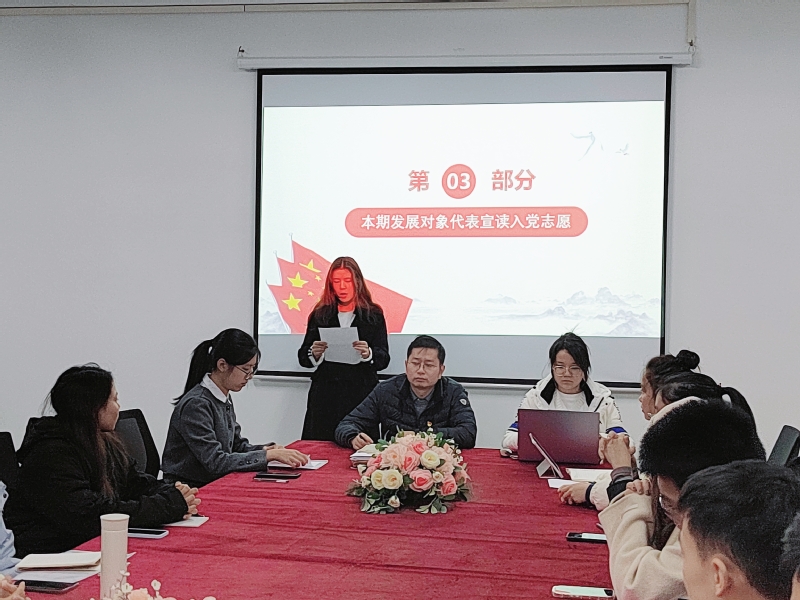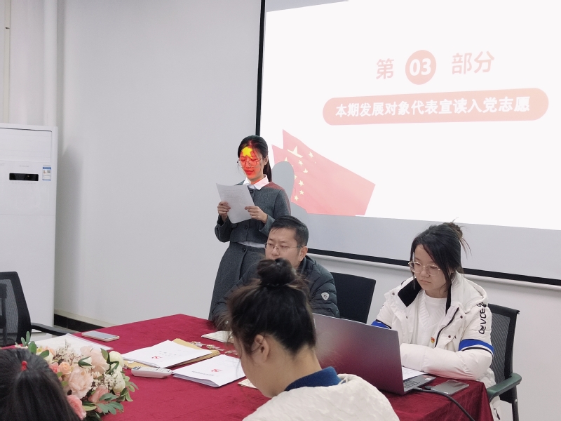 郭书嘉同志表态并宣读入党志愿。郭书嘉同志表示:“从提交入党申请书至今,我对党的认识在每一个阶段都有新的提高。道阻且长,行则将至,今后我会更加严格地要求自己,以初心敬党心;以誓言敬理想;以努力敬时光。”
