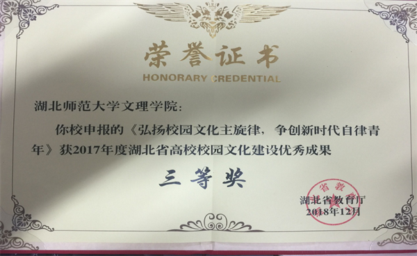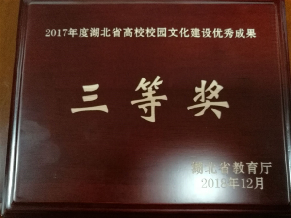 学校历来高度重视校园文化建设工作,充分发挥高校文化传承创新的优势与作用,不断创新新时代高校校园文化建设的理念、形式与方法。在省教育厅下发《关于开展2017年度湖北省高校网络文化建设优秀成果评选的通知》后,学校积极响应,经职能部门申报、校园文化评审小组评审、校领导审核,选送《弘扬校园文化主旋律 争创新时代自律青年》代表学校参评,在全省高校中脱颖而出,最终获得三等奖,为学校赢得了荣誉。