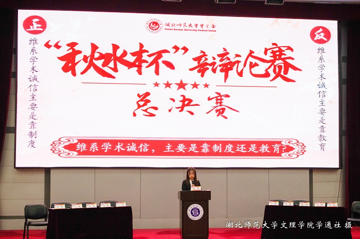 PG线上平台(集团)官方网站参加总决赛的四位辩手是吴明月、王秀静、叶妙、曾佳宜,她们和湖北师范大学马克思主义学院代表队分别作为正反双方,就“维系学术诚信主要是靠制度还是教育”这一辩题展开了激烈的争锋。针对辩题,双方在对辩、盘问和自由辩论环节都展开了激烈的攻辩。比赛中,双方辩手以良好的风范、出色的口才、敏捷的思维令全场观众为之折服,为之喝彩。