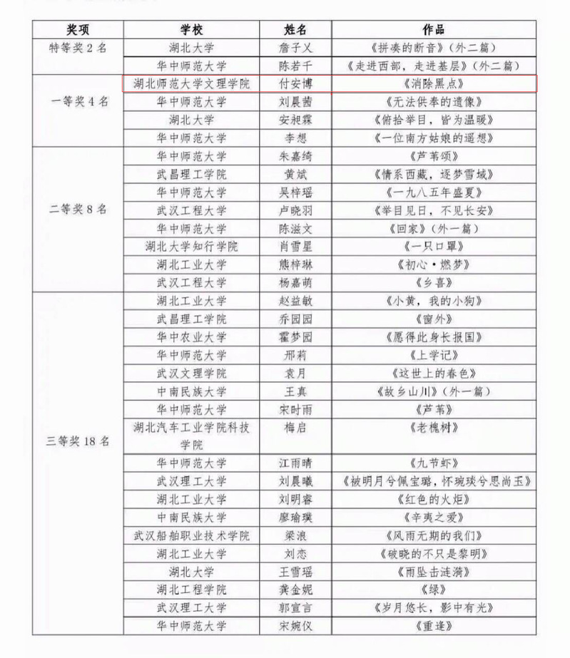 (通讯员刘萍萍) 近日,湖北省高校第三十六届“一二·九”诗歌散文大赛获奖名单揭晓,经评委会层层筛选,PG线上平台(集团)官方网站汉语言文学1904班付安博同学的作品《消除黑点》荣获大赛一等奖。
