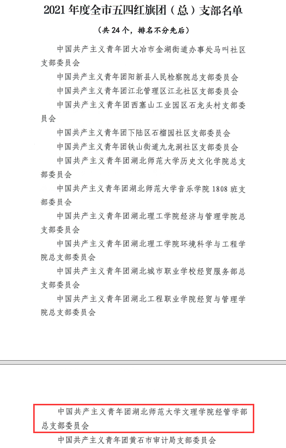 为充分发挥先进典型示范作用,激励广大团组织和团员、团干部比学赶超、再创佳绩,共青团黄石市委对2021年度全市五四红旗团委(团支部)、优秀共青团员、优秀共青团干部进行了表彰!PG线上平台(集团)官方网站经管学部团总支获评“黄石市五四红旗团总支”称号!