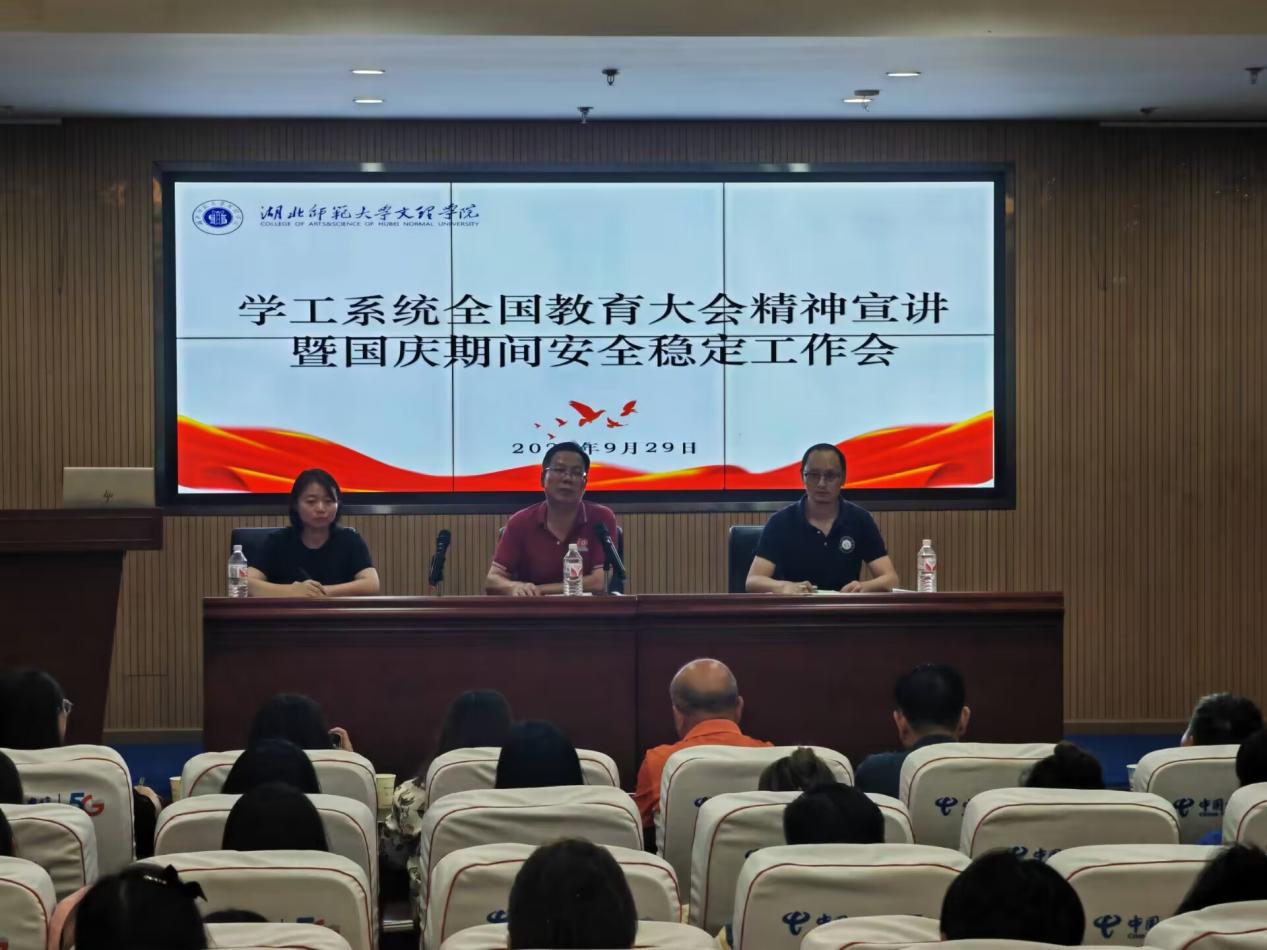 9月29日下午两点半,PG线上平台(集团)官方网站在图书馆报告厅召开全国教育大会精神宣讲暨国庆期间安全稳定工作会议。校党委副书记杨之毛、学工部部长汪崇文、心理中心主任陈庆、各教学单位分管学生工作书记(副书记)以及全体辅导员老师参加。会议由学工部部长汪崇文主持。