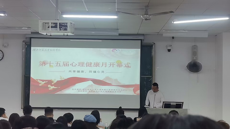 启动仪式分为四项流程:视频回顾第十四届心理健康月活动,心理中心主任陈庆老师介绍第十五届心理健康教育月方案,学工部副部长陈小龙致辞,心理中心曾程老师进行心理委员系列讲座第一讲。10月10日晚上19:00,伴随着第十五届心理健康教育月回顾视频的播放,本次心理健康月开幕式逐渐拉开帷幕。视频结束后,心理中心陈庆主任介绍了活动方案。本次心理健康月持续两个月,本次活动主题为“共建共治共享,同心健心安心”,活动构成为校级活动与部级活动,有主题开放日、心理普查项目等活动,尤其是心理委员系列培训,以及8个学部举办的特色活动。随后学工部副部长陈小龙致辞,提出两点希望:做好人生规划,把准成才方向;做好心理委员工作,通过心理班会、谈心谈话等,在工作中磨砺心智,增长才干。伴随学工部副部长陈小龙的宣布,标志着第十五届心理健康月系列活动正式开幕。