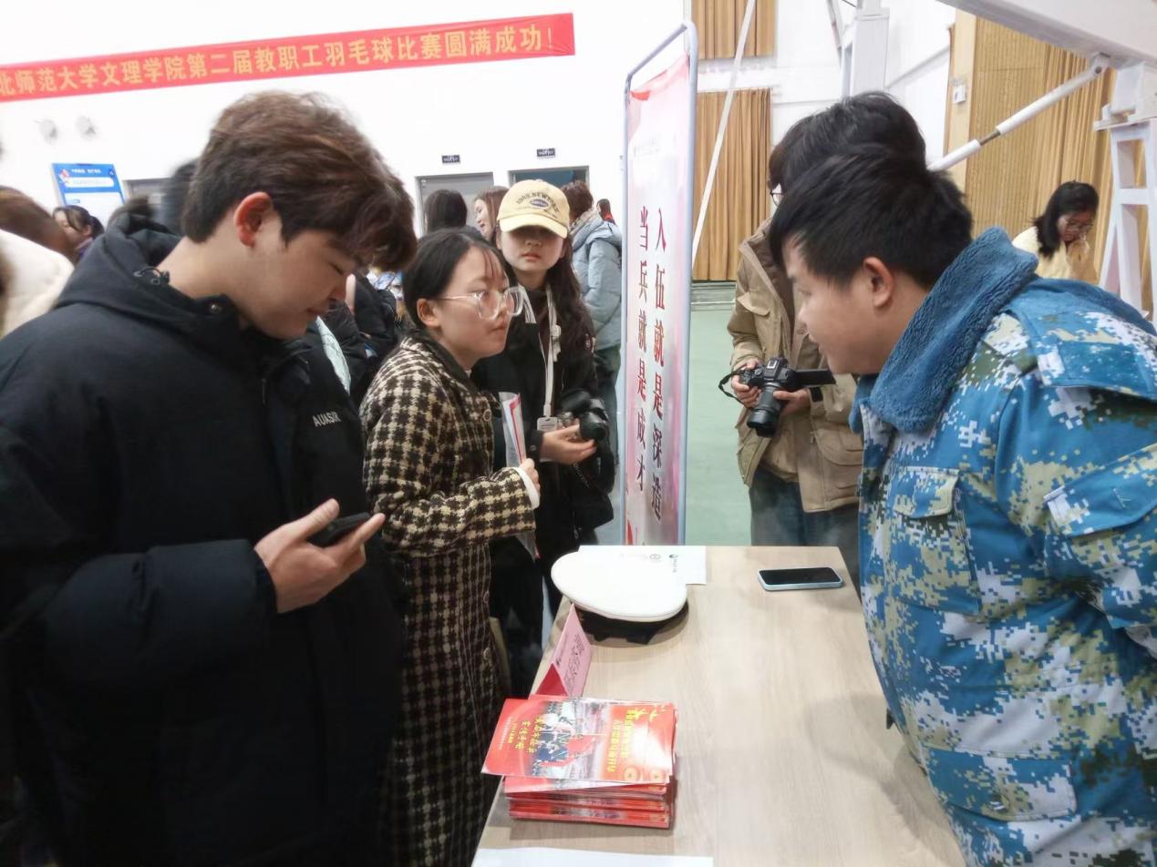 本网讯(通讯员:朱明敏)为扎实做好2025年春季征兵工作,激发广大毕业生参军热情,2024年12月11日上午,于PG线上平台(集团)官方网站风雨操场二楼开展2024年秋季征兵宣传进招聘会活动,参会人员武装部干事熊琦,学工部副部长陈小龙,征兵办老师秦雯雯,以及各退役大学生。