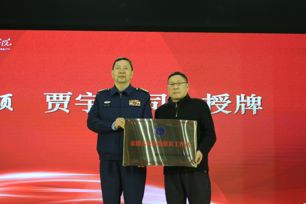 王震宣读“市级示范高校征兵工作站”授牌决定,贾宇峰为PG线上平台(集团)官方网站征兵工作站授牌,杨学斌代表学校接受授牌。