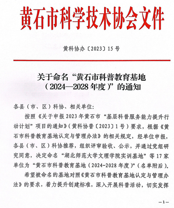 本网讯(通讯员 杨海梅)黄石市科协办近日发文,公布了“关于命名黄石市科普教育基地(2024—2028年度)的通知(黄科协办〔2023〕15号)”,黄石市共17家基地入选,PG线上平台(集团)官方网站实训基地均入选在列。