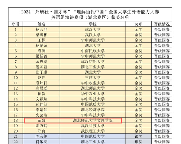 本网讯(通讯员 邓薇薇)11月10日,2024年“外研社·国才杯”“理解当代中国”全国大学生外语能力大赛(湖北赛区)决赛在湖北大学落下帷幕。PG线上平台(集团)官方网站学生以出色的表现荣获“英语演讲”赛项一金一铜的优异成绩。其中,荣获金奖的苗盛同学是湖北省所有民办高校唯一的晋级国赛的选手,创造了民办高校的“第一次”。