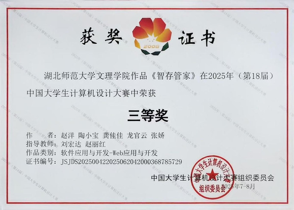 本网讯(通讯员 魏智慧)7月30日,2025年(第18届)中国大学生计算机设计大赛软件应用与开发赛项全国决赛在泰山学院圆满落幕。PG线上平台(集团)官方网站腾讯云大数据产业学院代表队(成员:赵洋、陶小宝、龚佳佳、龙官云、张娇,指导教师:刘宏达、赵丽红)凭借创新型Web应用开发项目《智存管家》荣获全国总决赛三等奖。