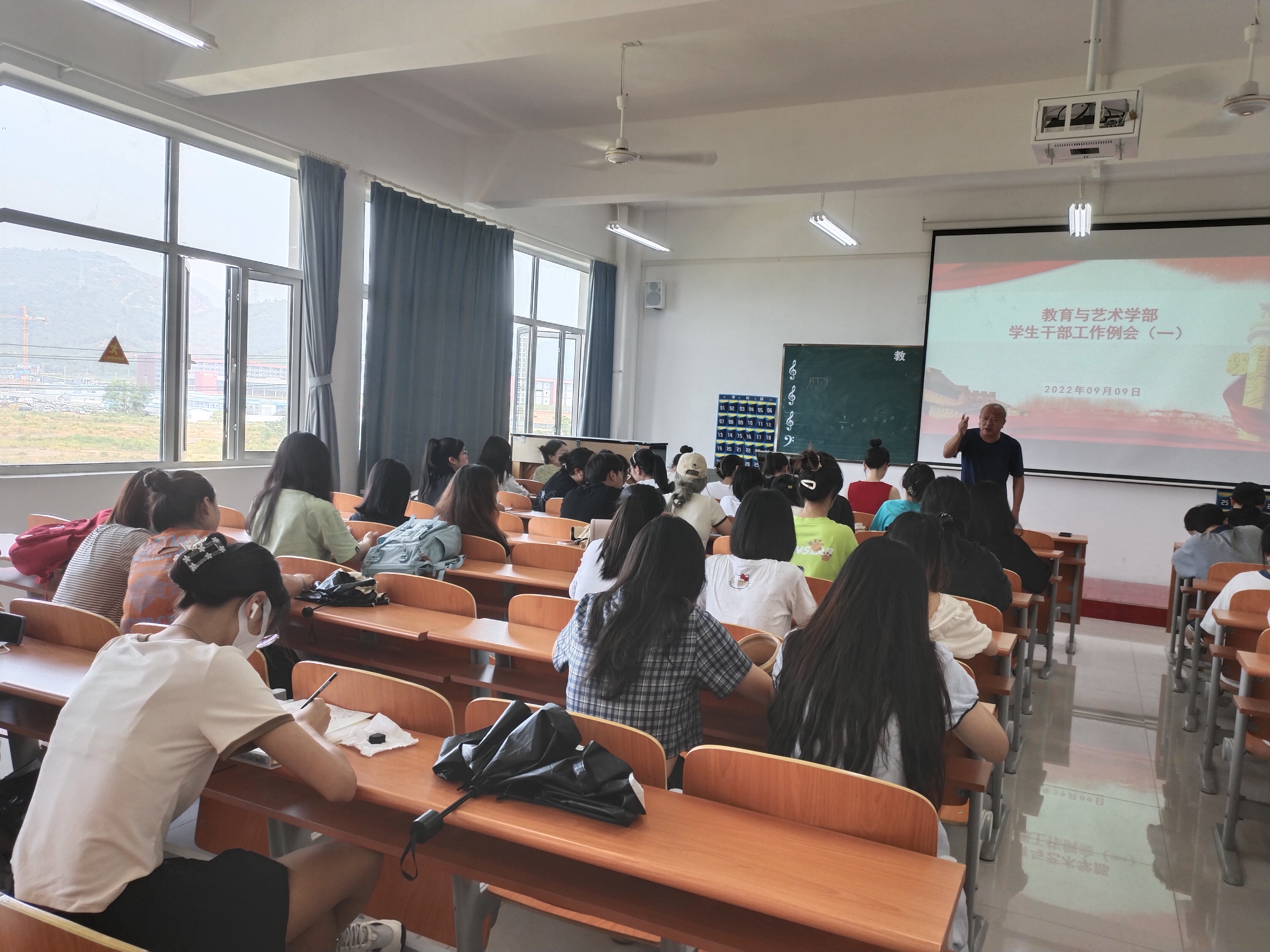 2022年9月9日中午12:00,按惯例学部在实验楼1-403教师组织召开学生干部例会,参会人员有辅导员,团学会干部,各专业班级负责人。会议由总支书记李先华主持。工作纪要如下:一、针对新冠病毒,多地呈现出散发的严峻情况下,强调工作必须不外出,非必要不要聚集,原则上无特殊情况不得离开黄石,做好个人防护勤洗手,学校要求下周每位学生全程佩戴口罩。