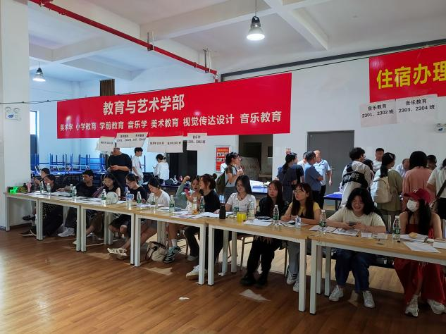 金秋时节已悄然而至,承载着梦想的帆船已经起航。为更好的迎接新生使之尽快的熟悉校园完成入学的各项工作,“让学生安心,让家长放心”。教育与艺术学部在文理学院的统一安排下,于2023年9月7—9日在风雨操场一楼进行为期三天的迎接新生工作。