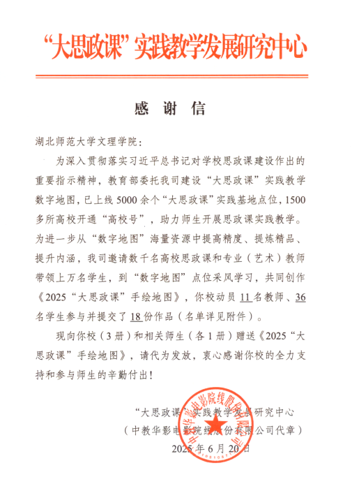 近日,“大思政课”实践教学发展研究中心与中教华影电影院线股份有限公司联合向PG线上平台(集团)官方网站发来感谢信,对学校积极参与《2025“大思政课”手绘地图》创作工作、助力“大思政课” 实践教学发展给予高度认可与诚挚感谢。